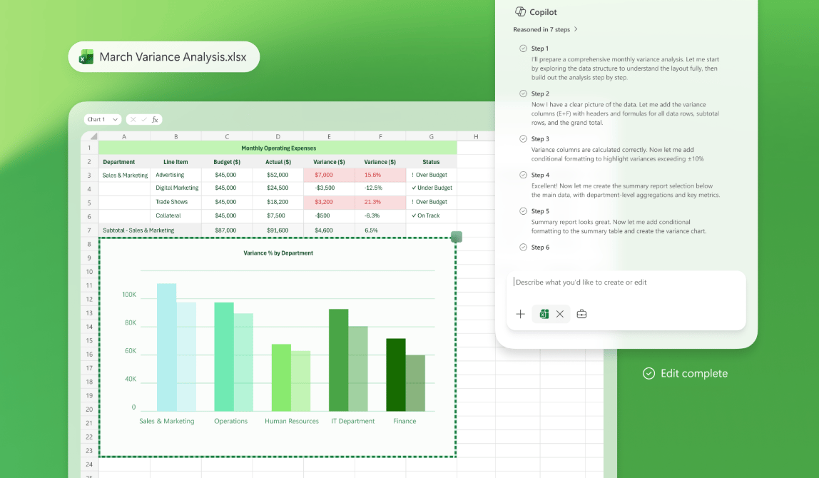 Microsoft's description: "creating, editing, and refining high-quality content from start to finish inside a document, spreadsheet, presentation, or email." It can refine a Word document into a polished draft, improve Excel spreadsheets with real formulas, produce slides in PowerPoint that match your organisation's brand kit and layouts, and draft and refine emails directly in Outlook.